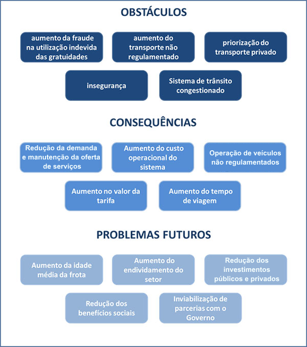 Por outro lado, o setor rodoviário lida diariamente com obstáculos que dificultam o pleno aproveitamento do sistema oferecido aos usuários. Estes entraves geram consequências e possíveis problemas futuros que impactam tanto a rede de transportes quanto aos usuários, conforme mostra o esquema abaixo: